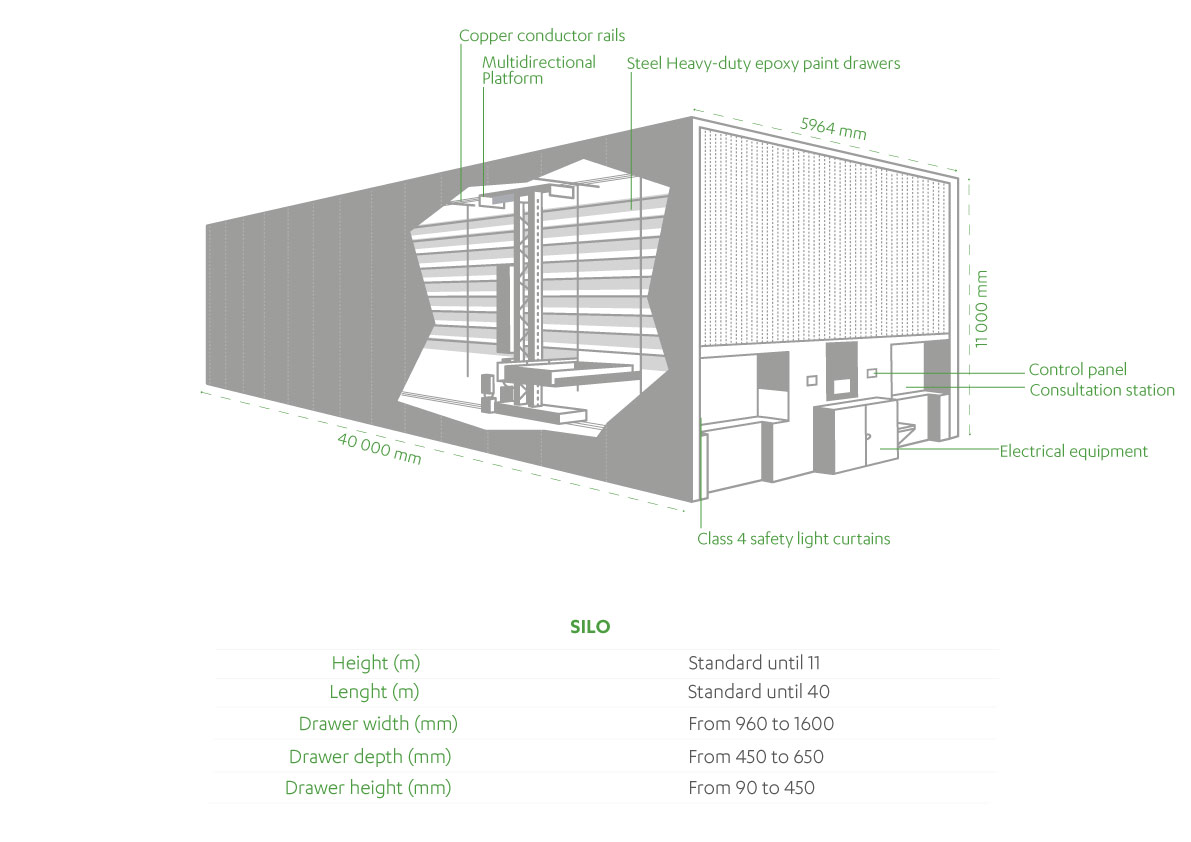The SILO ASRS automated storer, consisting of two racking systems and an automated trolley and crane system moving along the central aisle: offers you short access times, optimal storage space management, high handling throughput as well as optimal access to small and large volume-size supplies.
